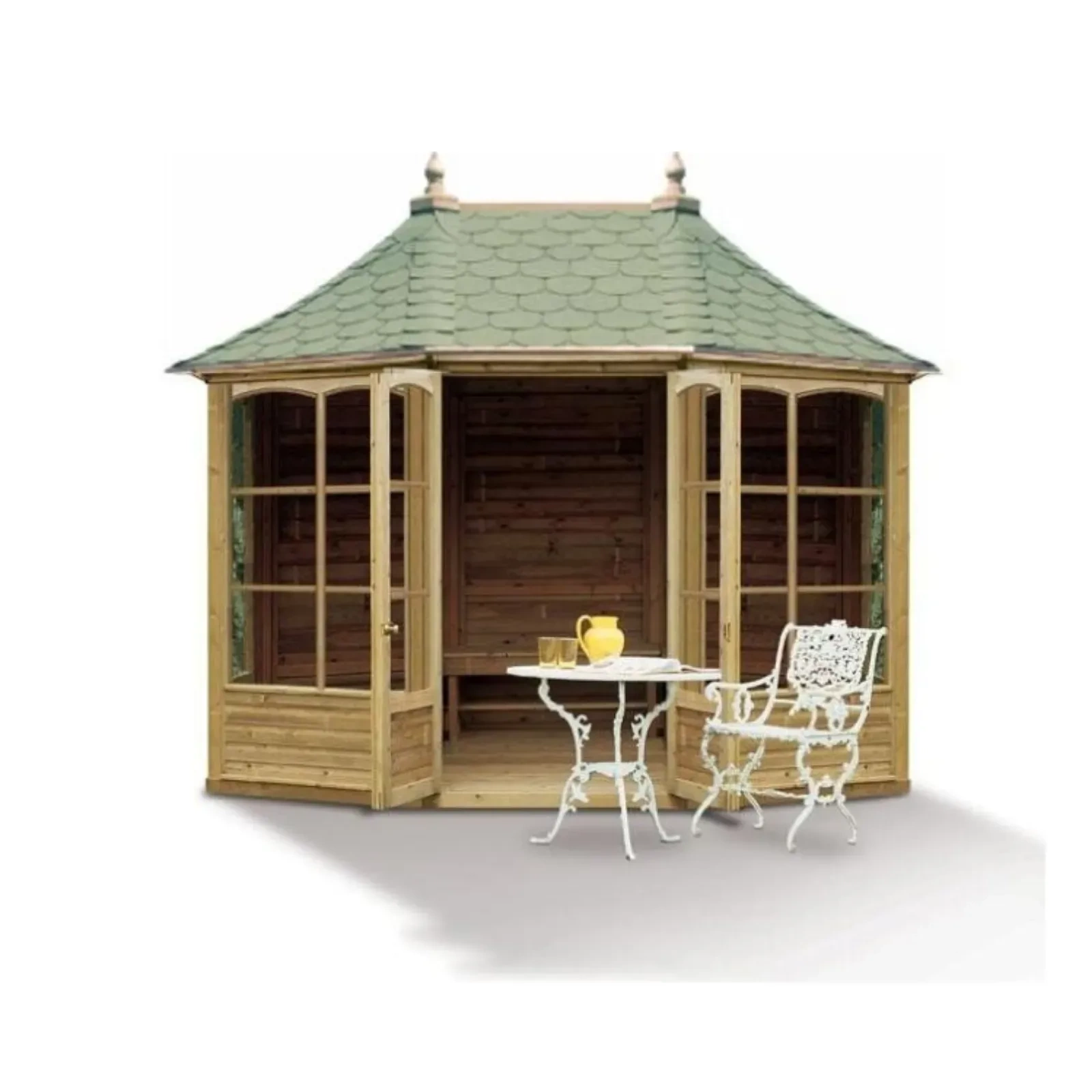 Hergestellt nach FSC-Standards aus unter Druck stehendem skandinavischem Fichtenholz, einschließlich Boden. Die Fenster und Türen sind mit 4 mm dickem gehärtetem Glas ausgestattet, und die Türrahmen sind aus britischem Messing gefertigt. Der Harrogate-Pavillon wird in einzeln verpackten Paneelen und mit einer Montageanleitung für Selbstbauer geliefert. Ein professioneller Montageservice ist verfügbar.
