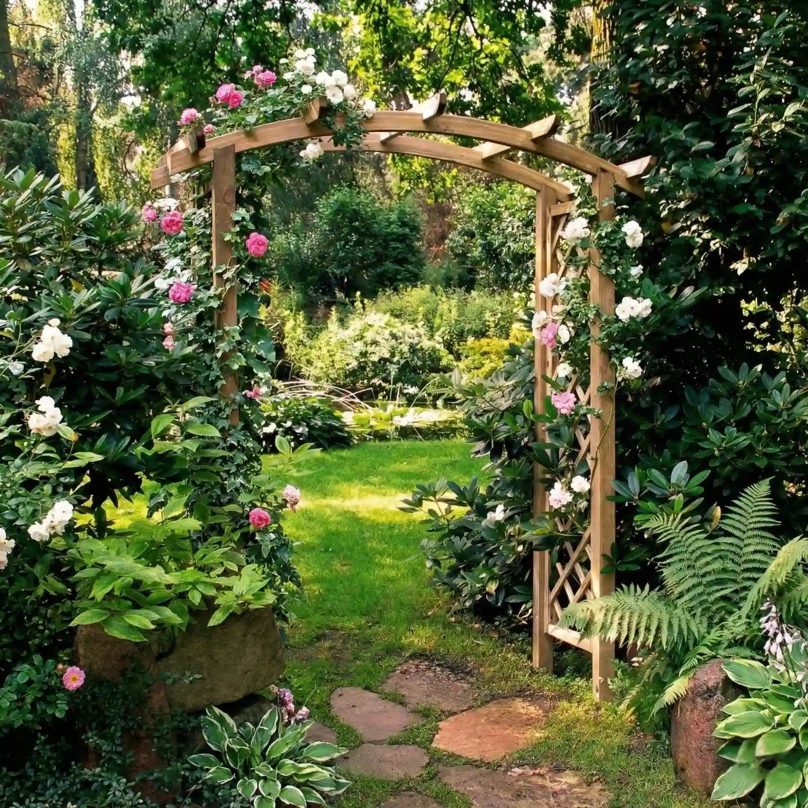 • The Arcade Garden Arch echoes the rounded arcade forms found in Roman architecture. With its tall archway and diagonal trellis side panels, it invites climbing plants to shape its silhouette over time.