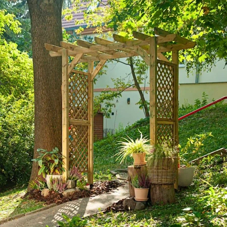 - The Henley Garden Arch is wider than most garden arches within our range and can be used to create a stunning focal point within your garden. The trellis side panels allow climbing plants such as Clematis or Roses to grow up and around this wooden arch.
