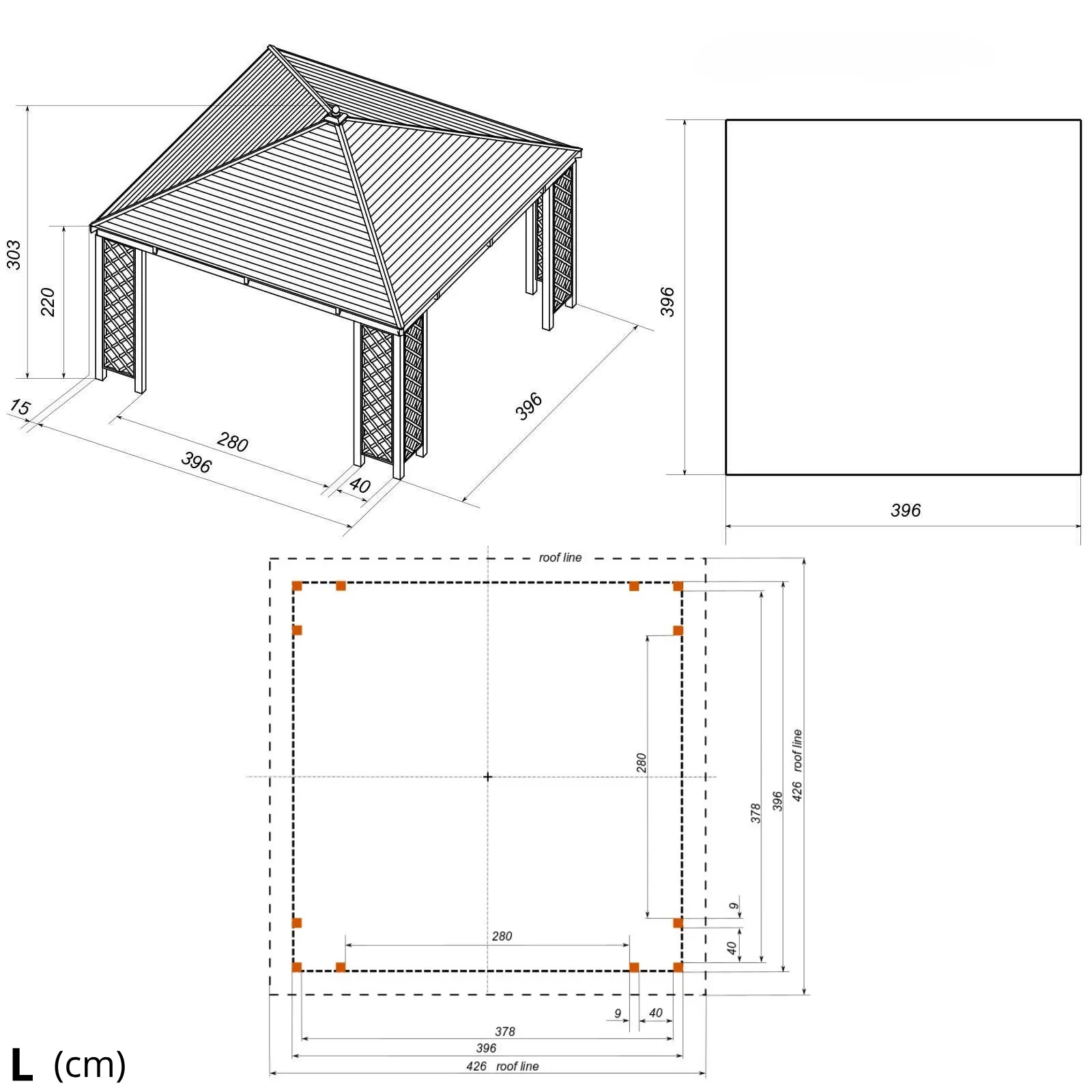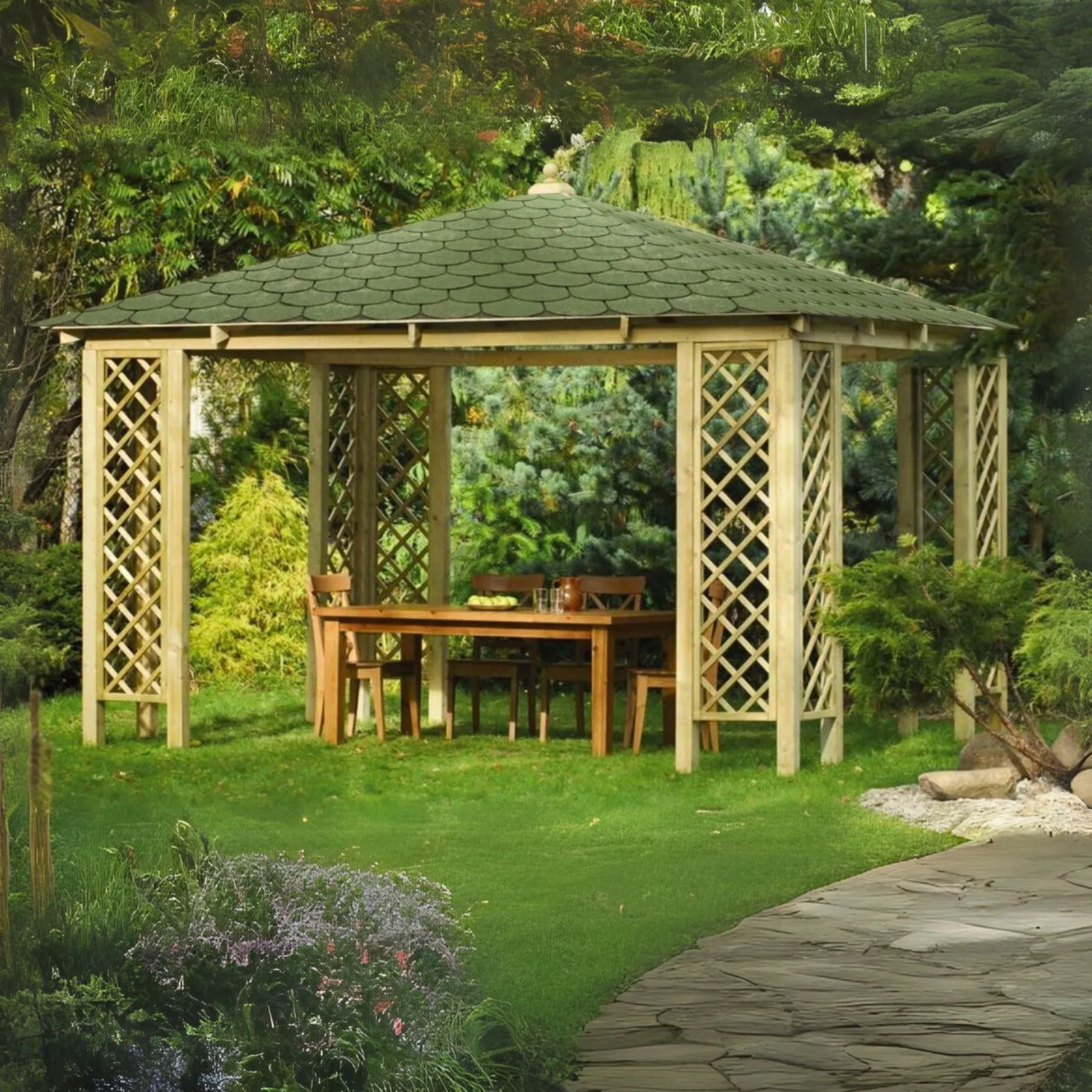 • Preciosa glorieta con enrejados en los rincones. El techo se puede cubrir con tejas bituminosas o tejas de alerce. Una estructura sólida para relajarse o celebrar una fiesta.
