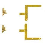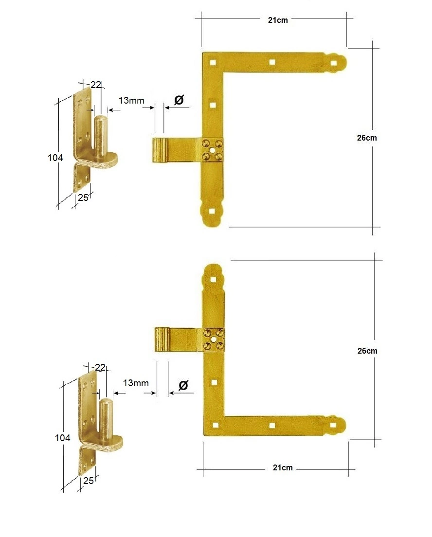 - Un bonito juego de dos bisagras (26x21cm) galvanizadas de color dorado, perfectas para cualquier portón de madera de nuestra oferta. Su recubrimiento galvanizado dorado aporta estética y resistencia a la corrosión y al desgaste exterior.