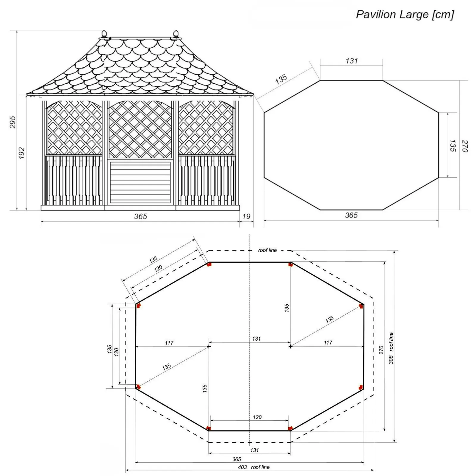 • Pabellón de madera con balaustrada y enrejado. El techo de tejas protege contra la lluvia. Mejora tanto la apariencia como la funcionalidad de tu espacio.