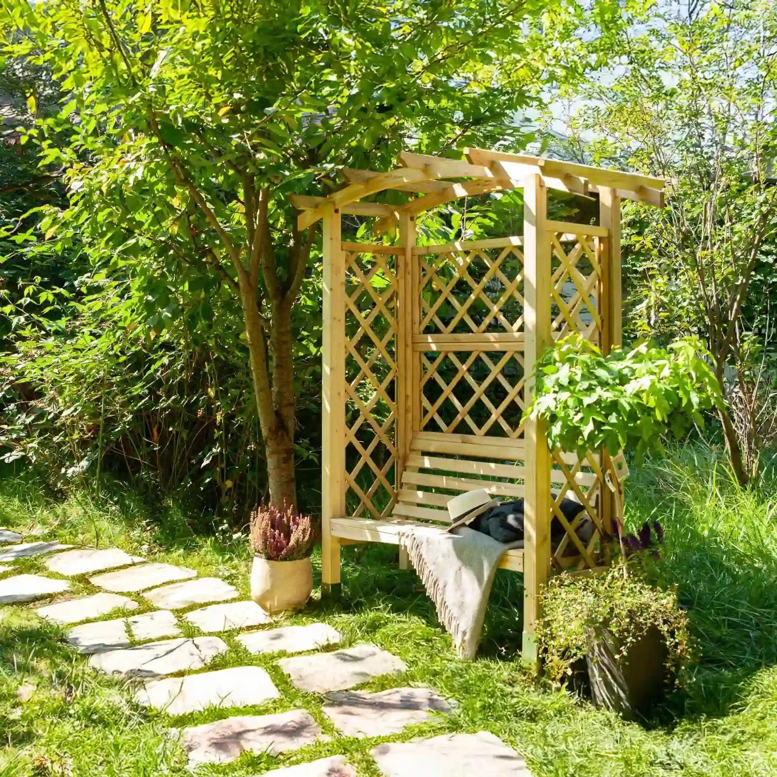 - Pérgola Linton con Banco es el lugar perfecto para relajarse y observar su jardín. Los enrejados diagonales en la parte trasera y los laterales permiten el cultivo de plantas trepadoras que crecerán alrededor de esta fantástica pérgola de jardín.