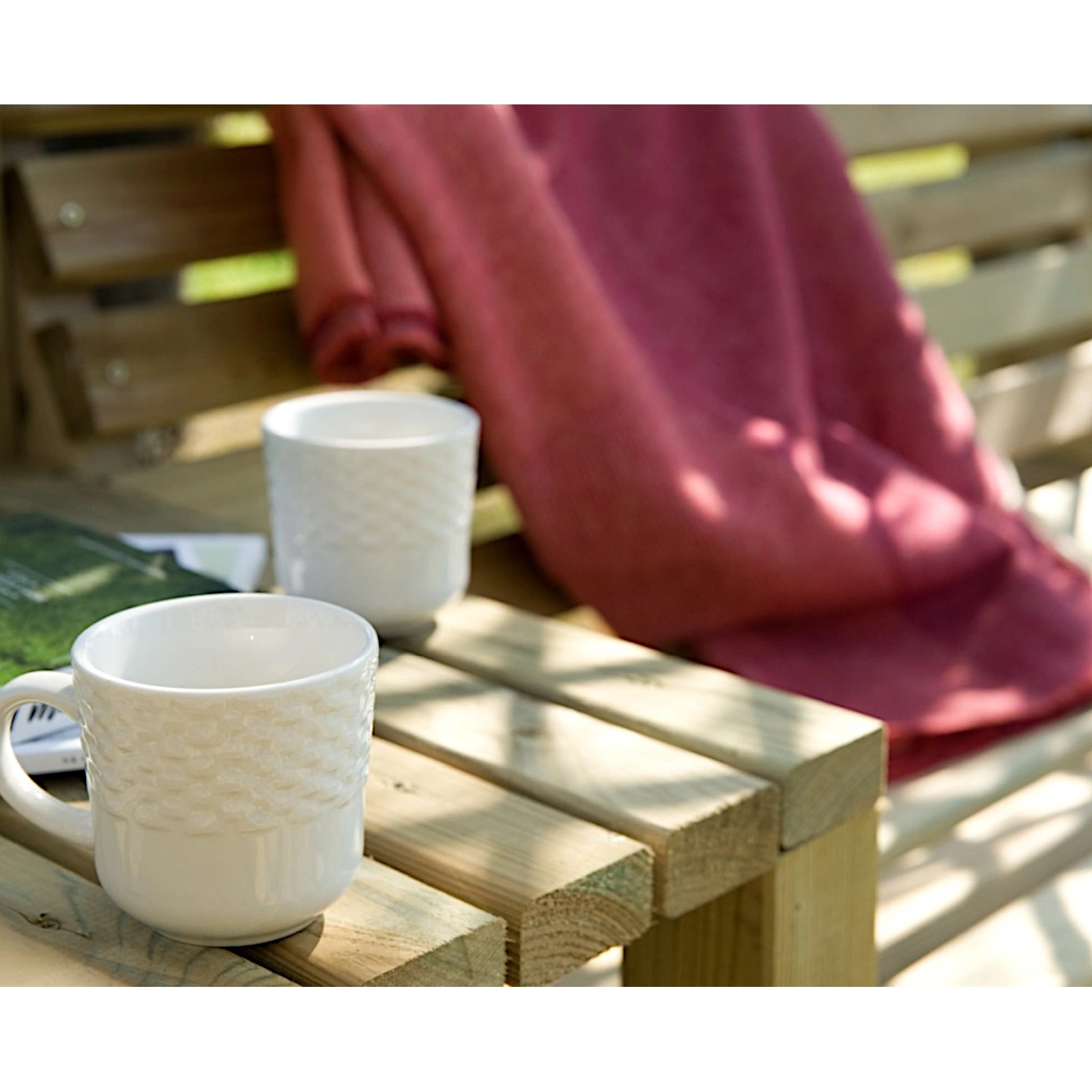 • Compacta y funcional: Gracias a su forma triangular, la pérgola Milton se adapta perfectamente a espacios pequeños, al tiempo que ofrece un cómodo espacio para sentarse para cuatro personas. Entre los bancos hay una práctica mesa, perfecta para tomar una taza de café, un libro o merendar.