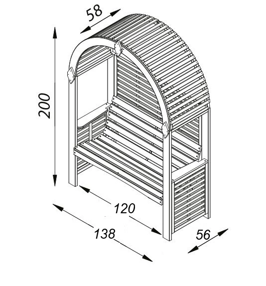 - Pérgola con cubierta sostenida por dos arcos de medio punto. Banco amplio y confortable con asiento perfilado, cómodos reposabrazos. Los fuertes postes de madera cortados transversalmente le dan estabilidad y elegancia.