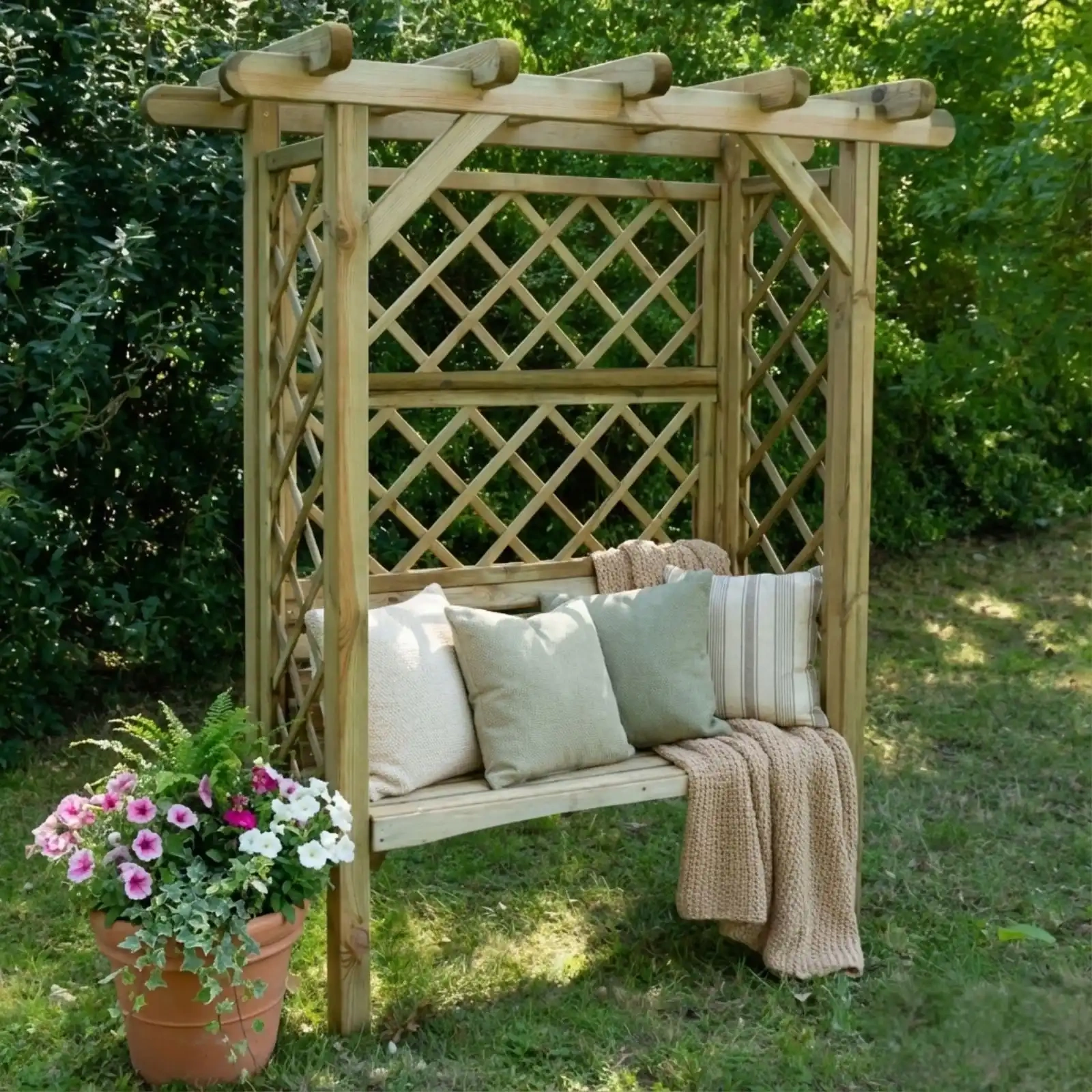 - Pérgola York Clásica con un banco cómodo. Un lugar perfecto para relajarse en el jardín. Los lados y la parte posterior de la pérgola están llenos de enrejados diagonales que no obstruyen la hermosa vista del jardín si estás sentado en el banco.