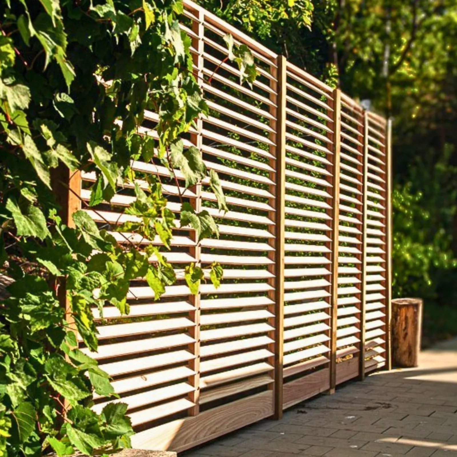 - Estética natural y moderna – Con su acabado en madera natural, esta valla de alerce se adapta perfectamente a cualquier tipo de entorno exterior, ya sea moderno, rústico o minimalista.