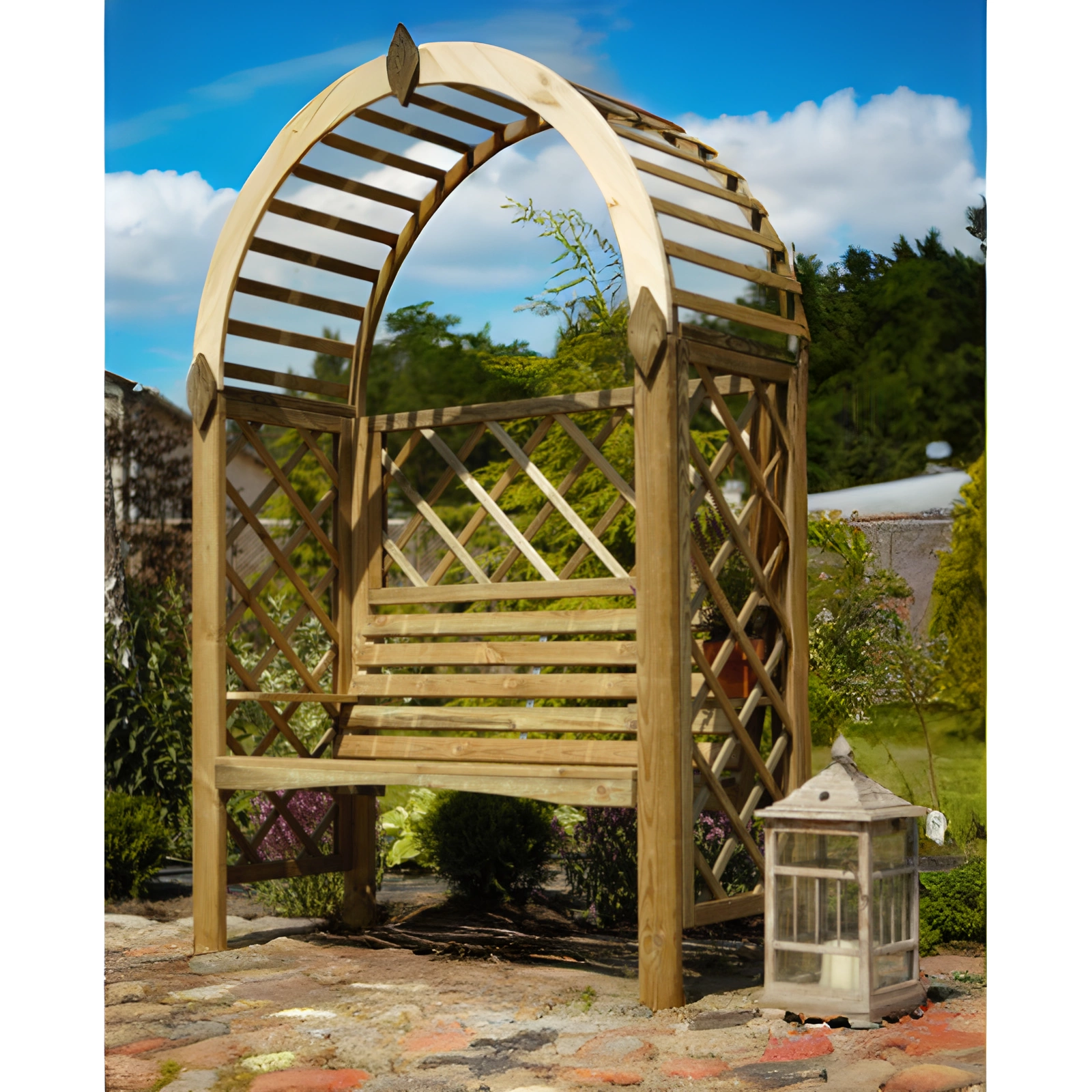 • Pergolato in legno con tetto ad arco. Una panca ampia e comoda con seduta profilata, comodi braccioli.